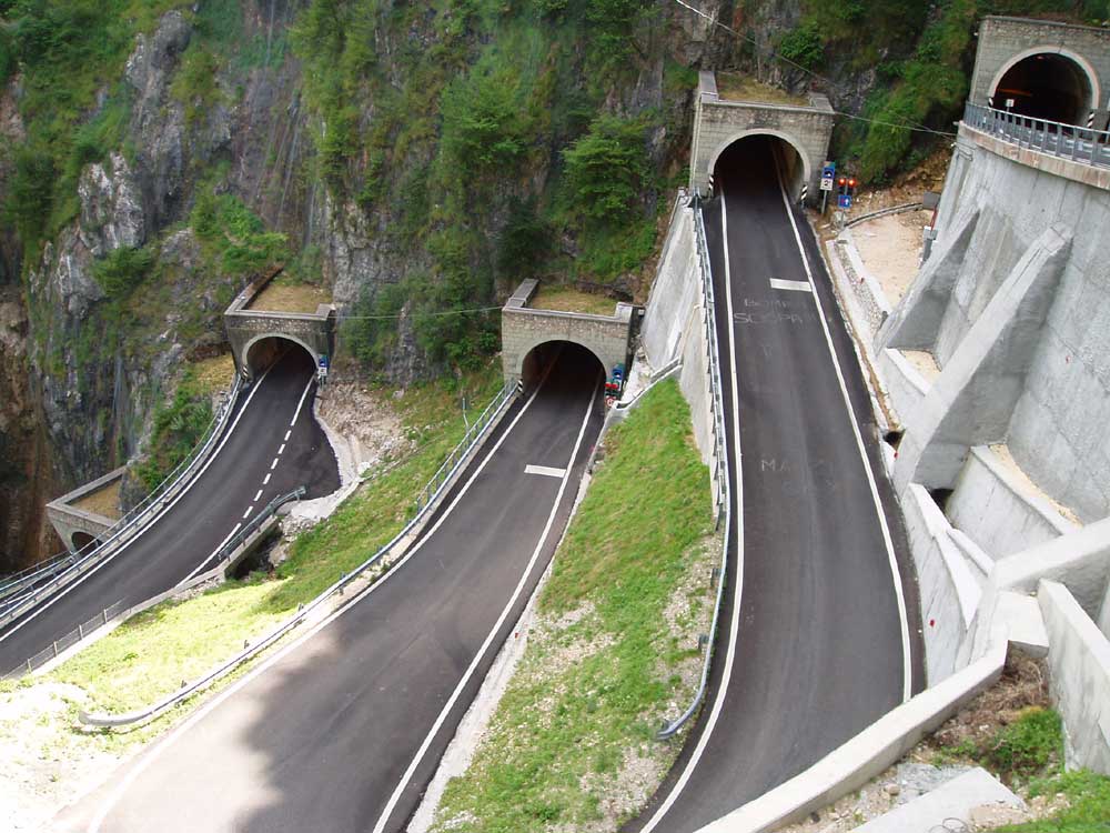 Au cours de l'une des étapes, nous avons franchi le passo di San Boldo. Avec ses 706 mètres d'altitude et ses 6 km de montée pour 470 mètres de dénivellation, cela ne vaudrait même pas la peine d'en parler. Il relie deux vallées distantes de 16 km (près du Monte Cimone). Mais c'est vraiment un col différent. Lorsqu'on quitte la vallée, on traverse le joli petit village de Tovena, puis la route s'élève gentiment: 5, 6, 7%. Et l'on s'approche de la montagne ; une paroi rocheuse, vertigineuse se dresse devant nous. Et l'on se demande bien où l'on va passer. Notre impatience est mise à rude épreuve. Plus on monte et plus l'on s'approche de cette paroi. Il faudra bien la traverser ou passer par-dessus. Puis, surprise ! Au détour d'un virage, on aperçoit la route sur quatre niveaux différents et les épingles à 180 degrés creusées dans la montagne. La route est étroite et ne permet qu'un sens de circulation. Des feux règlent le trafic. Après moins de 3 km, après le dernier tunnel, on découvre le sommet.